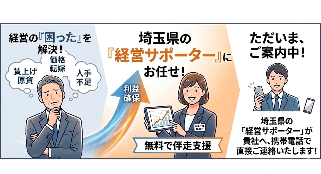 無料相談で採用力強化を実現🌟埼玉県経営サポーター事業 【Bizくま】無料相談で採用力強化を実現🌟 \埼玉県「経営サポーター」による無料の経営相談・伴走支援のご案内/ 会社名 御中 お客様 様 熊谷商工会議所「Bizくま」です。 賃上げ、価格転嫁、人手不足など、様々な経営課題への対応が求められる中、埼玉県では、事業者の皆様の利益確保を目的とした無料の専門家相談制度「経営サポーター」を開始いたしました。「賃上げの原資となる利益を確保したい」「価格転嫁を進めたい」といった課題に対し、中小企業診断士の資格を持つ経営サポーターが、熊谷商工会議所の経営指導員と連携しながら、国や県の支援策とのマッチングを行い、事業者の皆様の取り組みをサポートいたします。 経営サポーターは、このようなお悩みを無料で解決します・賃上げをしたいが利益が確保できない・価格転嫁を進めたい(適正な価格での取引を支援)・人手不足を解消したい・DXや省力化により生産性を向上させたい・新事業を開拓したい・資金繰りの相談をしたい 詳細はこちら! 【経営サポーターからのご連絡について】現在、本制度をご案内するため、担当の経営サポーターから事業者様へ、直接携帯電話よりお電話を差し上げております。見慣れない携帯番号からの着信となる場合がございますが、埼玉県の公的な無料支援制度のご案内となりますので、ぜひお気軽にお話をお聞かせいただけますと幸いです。 【お問い合わせ先】・熊谷商工会議所 中小企業相談所 TEL 048-521-4600・(一社) 埼玉県商工会議所連合会 TEL 048-647-4115 【公式】熊谷商工会議所 お店紹介動画配信中 チャンネル登録、高評価 よろしくお願いいたします! 発行人:地域によりそい 会員とともに”まちの未来を創る”「熊谷商工会議所」 熊谷商工会議所 日本360-0024 埼玉県熊谷市問屋町2-4-1 ソシオスクエア内 048-521-4600 配信停止 配信設定を変更