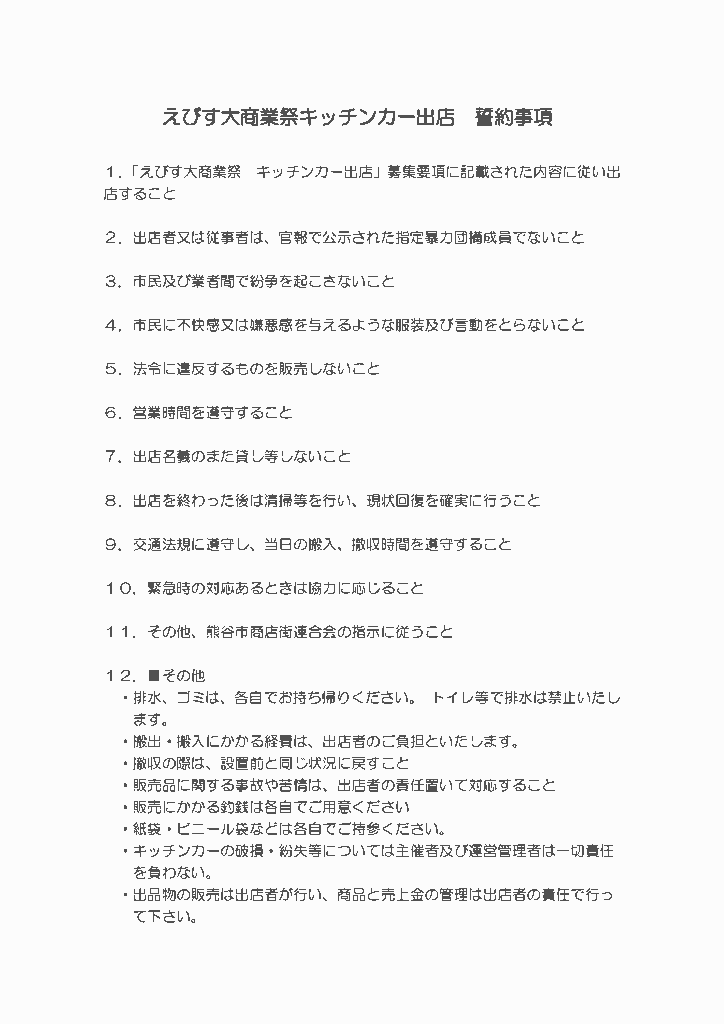 「えびす大商業祭 キッチンカー」出店のご案内 投稿日 2024年9月17日 更新日 2025年9月4日 著者 熊谷商工会議所 カテゴリー お知らせ カテゴリー 耳より情報 熊谷市商店街連合会では、商売繁盛を祈って毎年「熊谷えびす大商業祭」を開催しています。今年度も、えびす祭りに併せて、星川通りで「星川秋のキッチンカーフェス」を開催いたします。 下記の「実施概要」「誓約事項」をご確認の上、「出店申込」よりお申込みください。奮ってご参加くださいますようご案内申し上げます。 実施概要 (クリックするとPDFが開きます) 誓約事項 (クリックするとPDFが開きます) 出店申込 (クリックするとPDFが開きます)