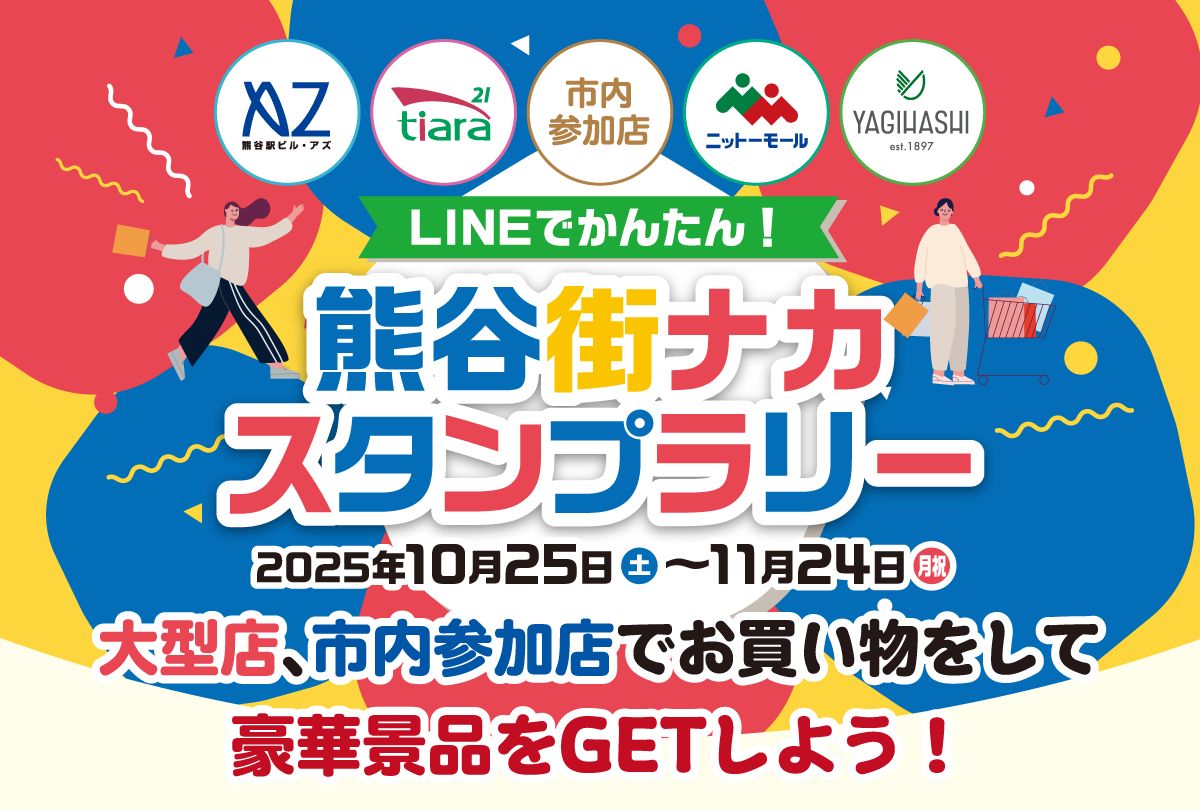 まちなか元気事業の一環として、「LINEでかんたん!熊谷街ナカスタンプラリー」を開催します。対象店舗をご利用いただきデジタルスタンプを集めると、集めたスタンプの数や種類に応じて賞品がもらえます。