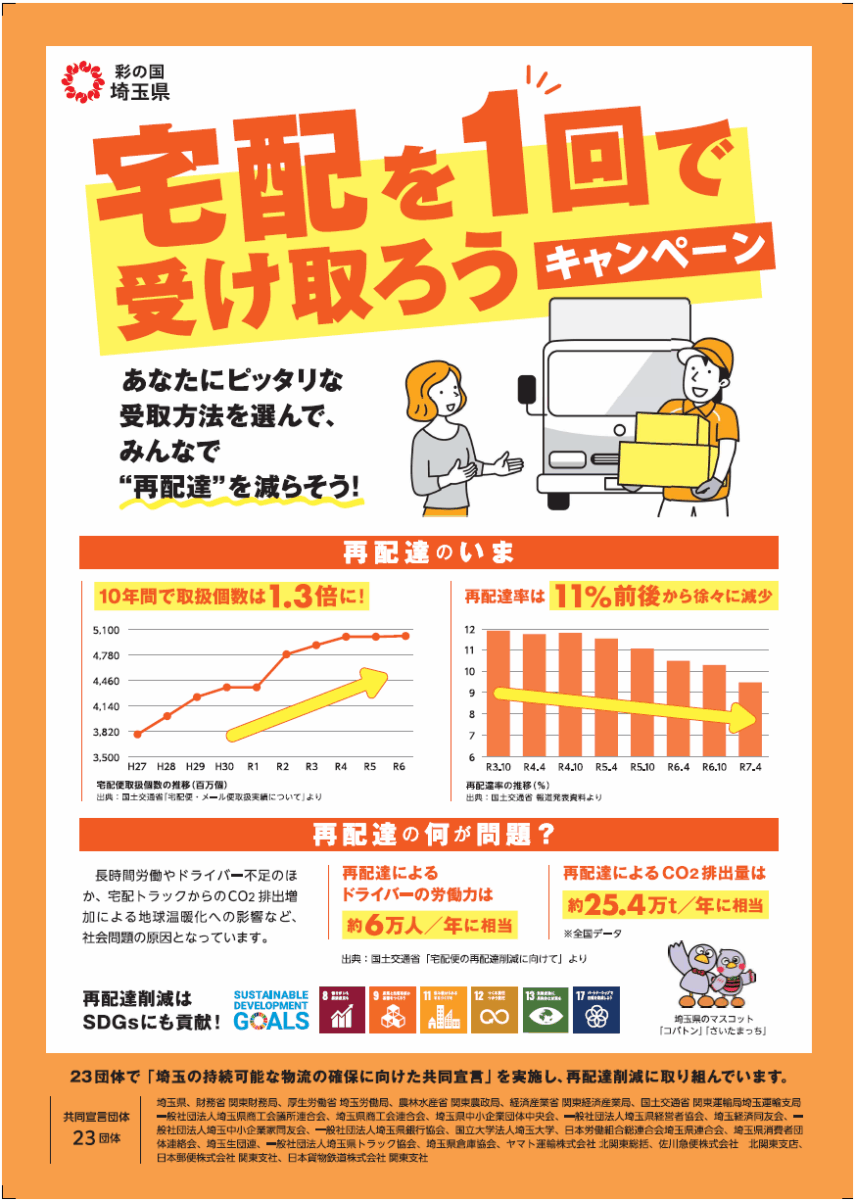 物流業界が深刻なドライバー不足となる中、埼玉県ではドライバーの負担を軽減させるため、「宅配を1回で受け取ろうキャンペーン」を展開し、再配達の削減を呼び掛けています。
