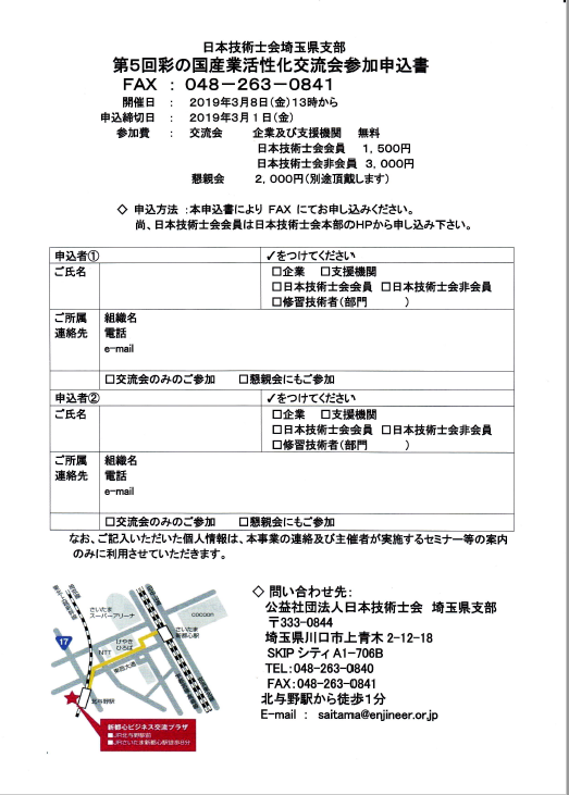 第5回彩の国産業活性化交流会を開催します。 投稿日 2019年1月17日 著者 熊谷商工会議所 カテゴリー お知らせ カテゴリー 耳より情報 公益社団法人 日本技術士会では「技術士はこんな支援ができます」をテーマに特別講演、交流会を開催します。 詳細、申込方法につきましては下記PDFにてご確認ください。 申込用紙はコチラです。