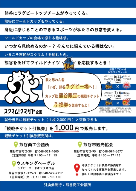 ワイルドナイツ応援キャンペーン! 投稿日 2019年6月27日 著者 熊谷商工会議所 カテゴリー お知らせ カテゴリー 耳より情報 ワイルドナイツ「観戦チケット引換券」の販売をしています! 7月6日(土)19時から熊谷ラグビー場で行われるワイルドナイツ対Honda HEAT戦の試合当日に、観戦チケット(1枚2,000円)と交換できる「観戦チケット引換券」を1,000円で販売しています! 通常2,000円のところ1,000円で観戦できるお得な引換券です! 是非この機会にワイルドナイツを応援しましょう! 詳細はチラシをご参照ください!