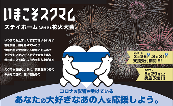 【クラウドファンディング】今年はおうちで楽しもう|ステイホーム(だけど)熊谷花火大会 投稿日 2021年2月26日 著者 熊谷商工会議所 カテゴリー お知らせ カテゴリー 熊谷市のイベント情報 一般社団法人熊谷市観光協会では、ステイホームで楽しむことが出来る花火大会の開催のためのクラウドファンディングを開始しています。 歴史ある熊谷市のイベントを継続させる為に皆様のお力を頂ければ幸いです。 クラウドファンディングの詳細につきましては下記バナーよりご確認ください。