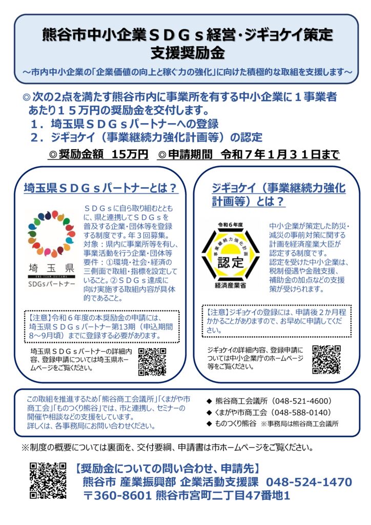 熊谷市中小企業SDGs経営・ジギョケイ策定支援奨励金のご案内