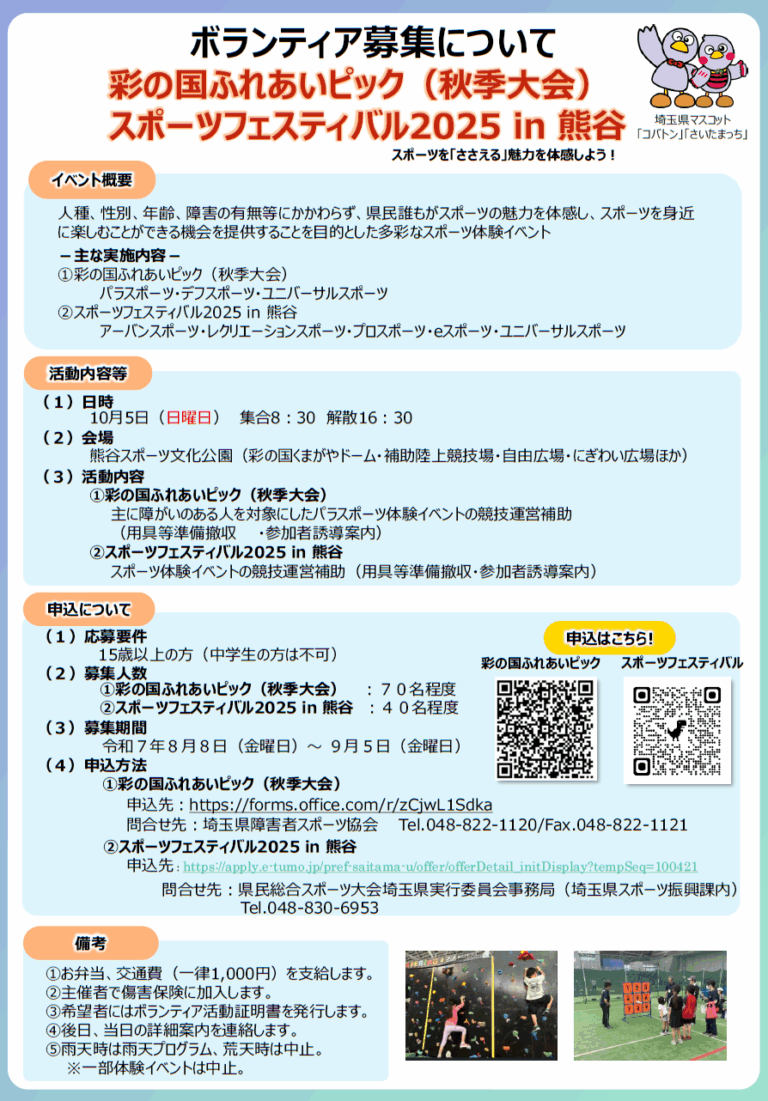【ボランティア募集のお知らせ】彩の国ふれあいピック(秋季大会)・スポーツフェスティバル2025 in 熊谷