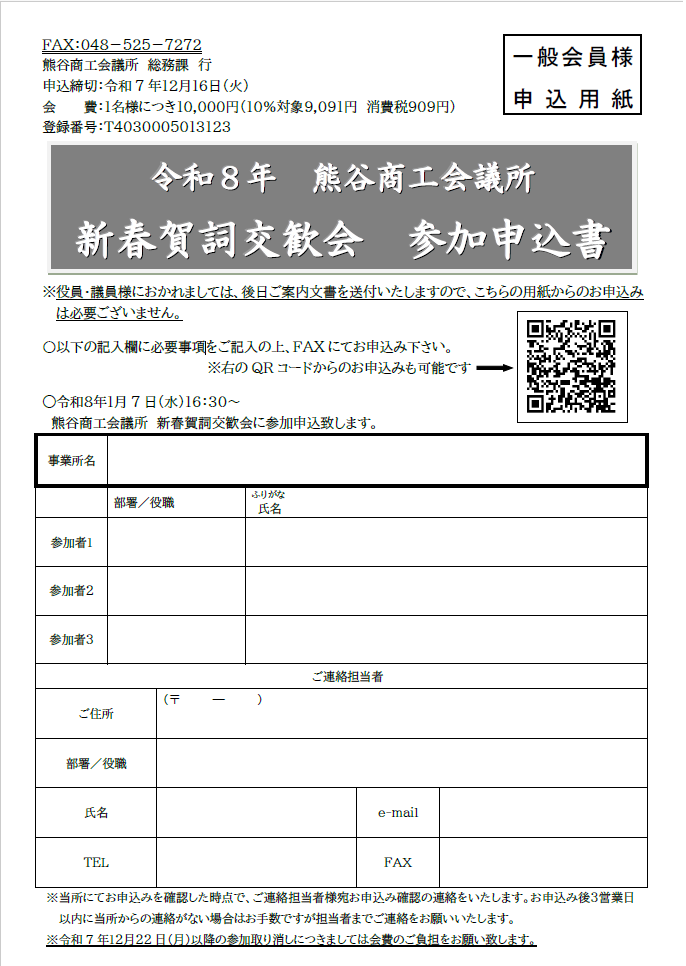 お申込みにつきましては同じく下記「賀詞交歓会 参加申込書」をダウンロードしていただき、FAXにてお申し込みください。